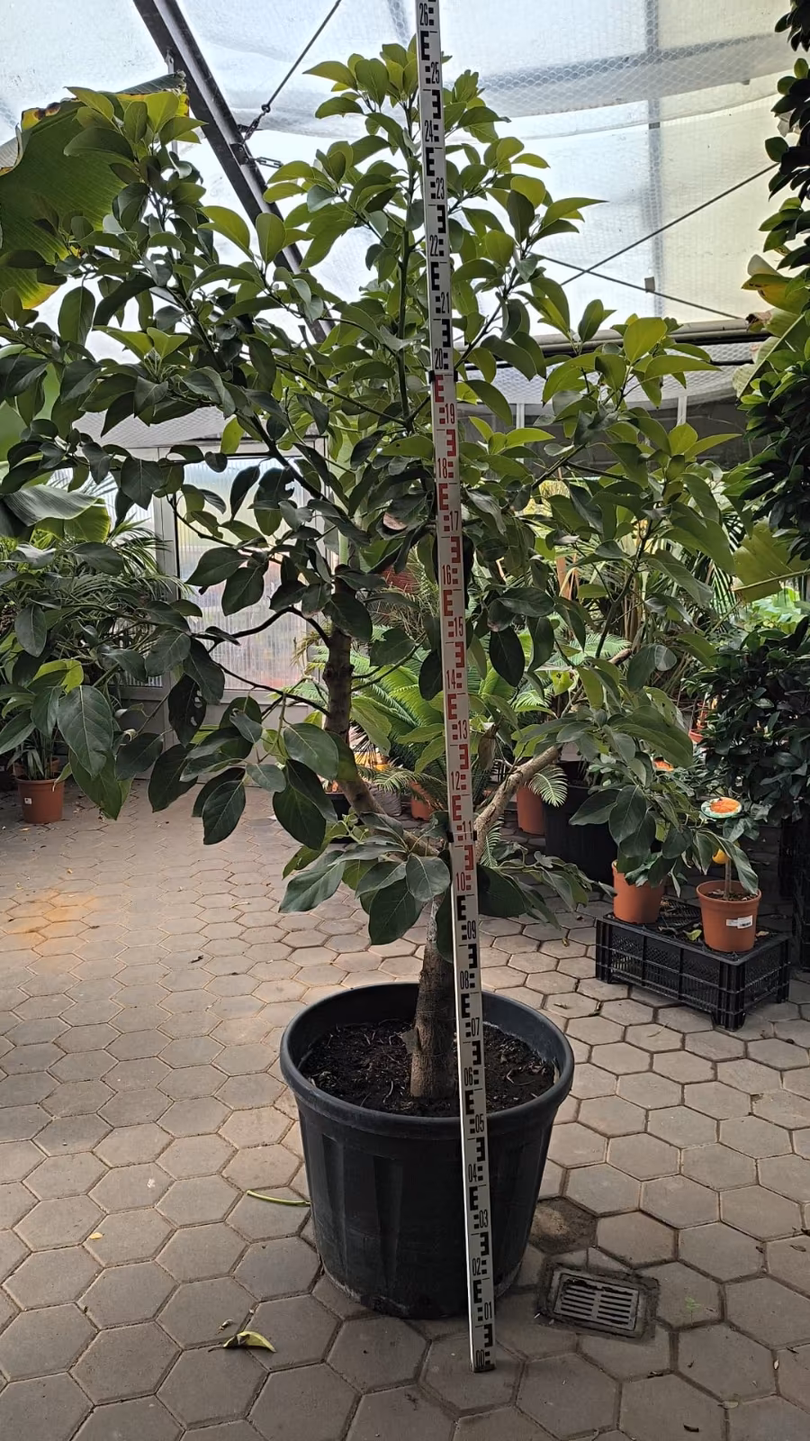 Exklusives XXL-Exemplar mit extra dickem Stamm – bereits fruchtfähig für Wintergarten und große Kübel. Lieferhöhe 240–280 cm (inkl. Topf).