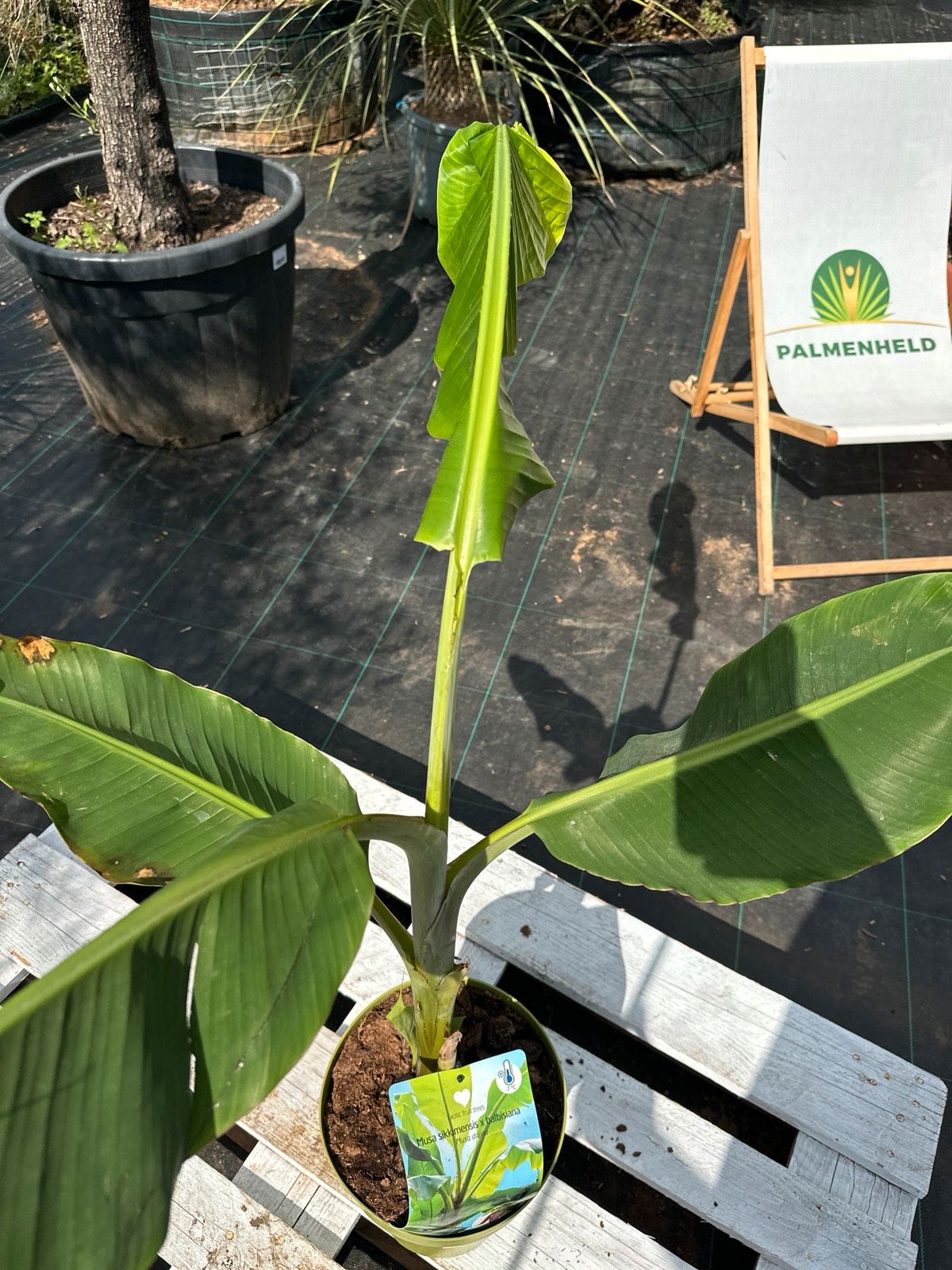 Robuste Hybrid-Zierbanane (M. sikkimensis × M. balbisiana) mit schnellen Trieben und großen, tropischen Blättern – ideal für Kübel und Beete. Lieferhöhe 80–120 cm (inkl. Topf).