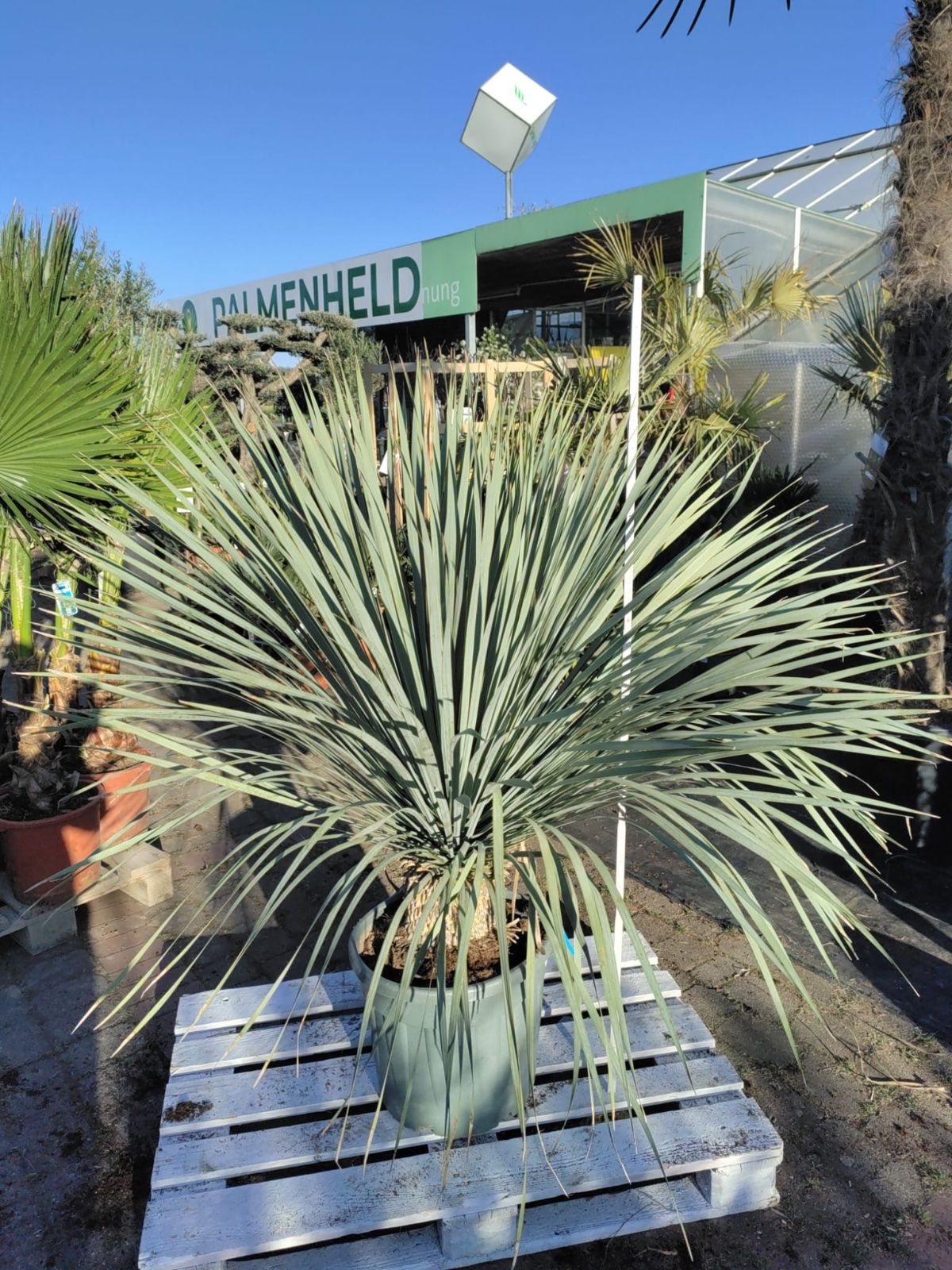 - 1× Blaue Palmlilie (Yucca rostrata), 100–140 cm (inkl. Topf), Stamm ca. 20–40 cm
