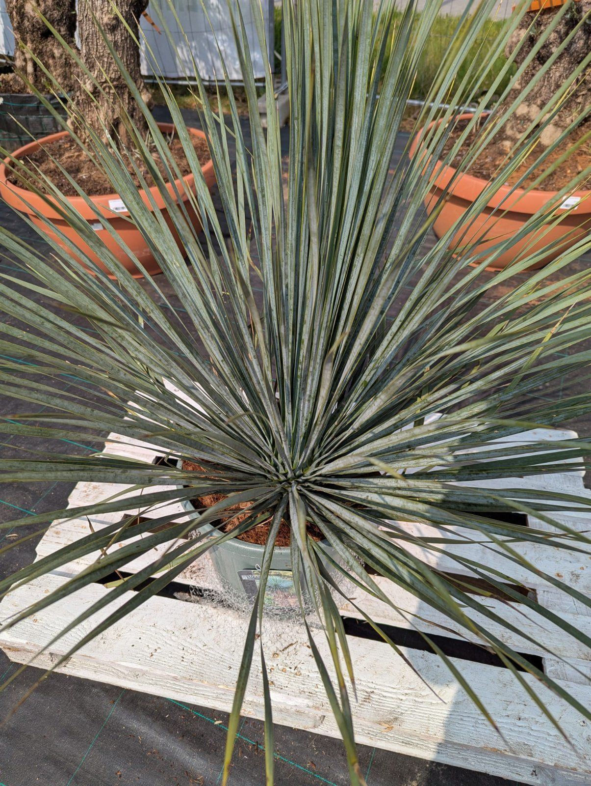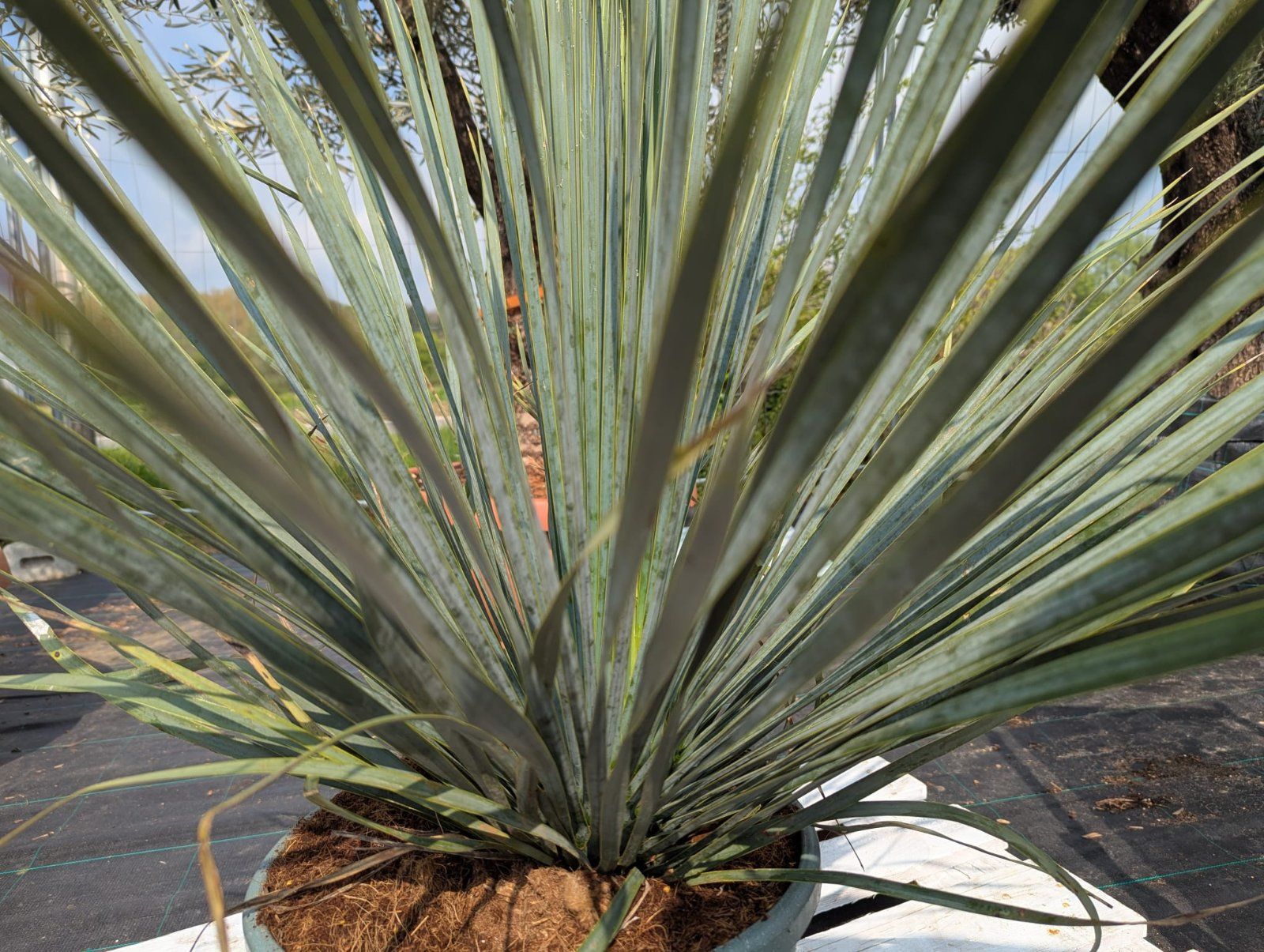 Markante Wüsten-Yucca mit strahlenförmig angeordneten, schmalen, silberblauen Blättern und modernem, architektonischem Erscheinungsbild. Das angebotene Exemplar hat eine Lieferhöhe von 90–120 cm (inkl. Topf) und zeigt bereits einen gut sichtbaren Stammansatz – ideal als zukünftiger Solitär für sonnige, trockene Standorte.