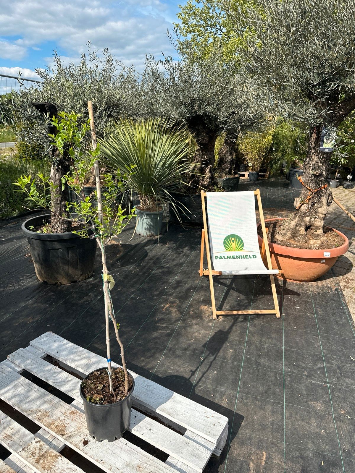 Exotisches Obstgehölz mit süß-aromatischen Früchten und dekorativer Herbstfärbung – ideal für Garten und große Kübel an warmen, sonnigen Standorten. Lieferhöhe 120–140 cm (inkl. Topf).