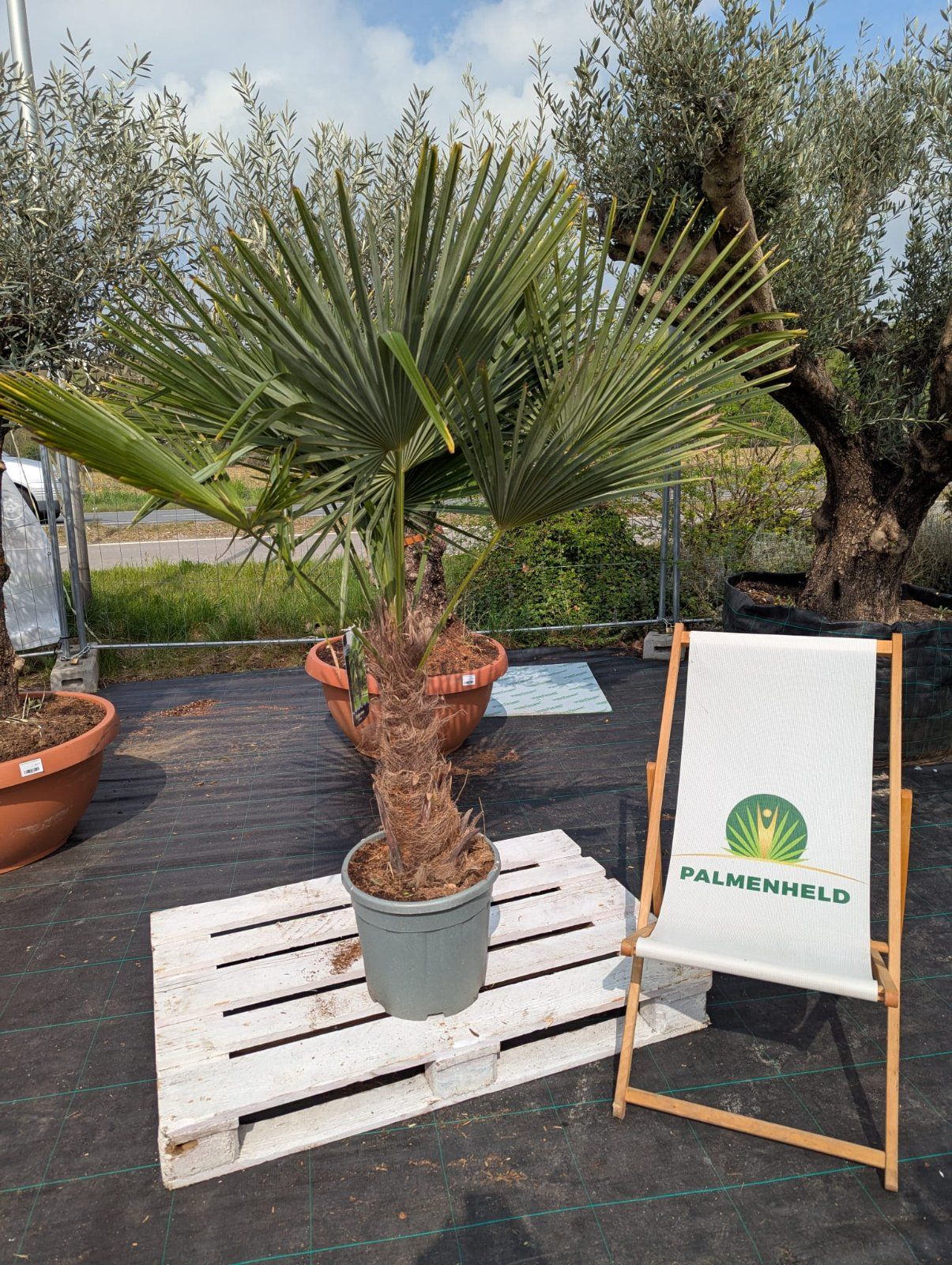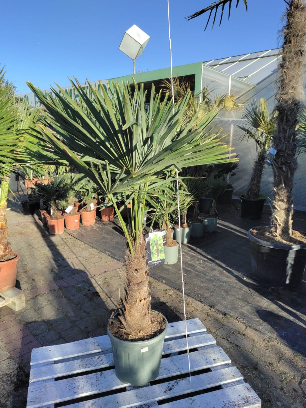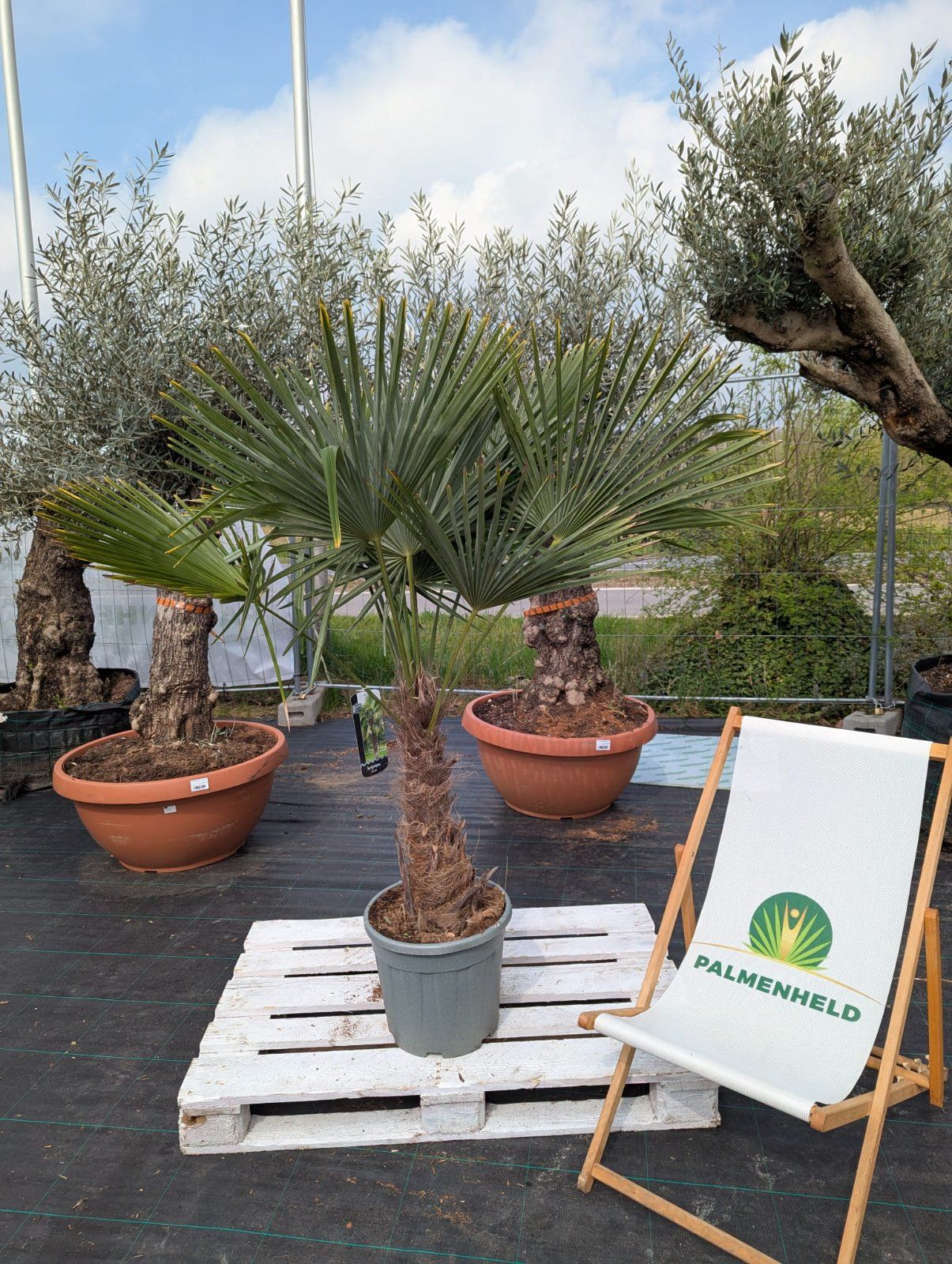 Robuste, winterharte Fächerpalme für Garten, Terrasse & große Kübel – sofort mediterranes Flair dank kräftigem Stamm und dichter Krone. Lieferhöhe 160–200 cm (inkl. Topf).