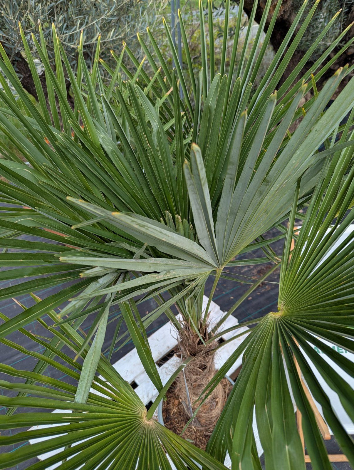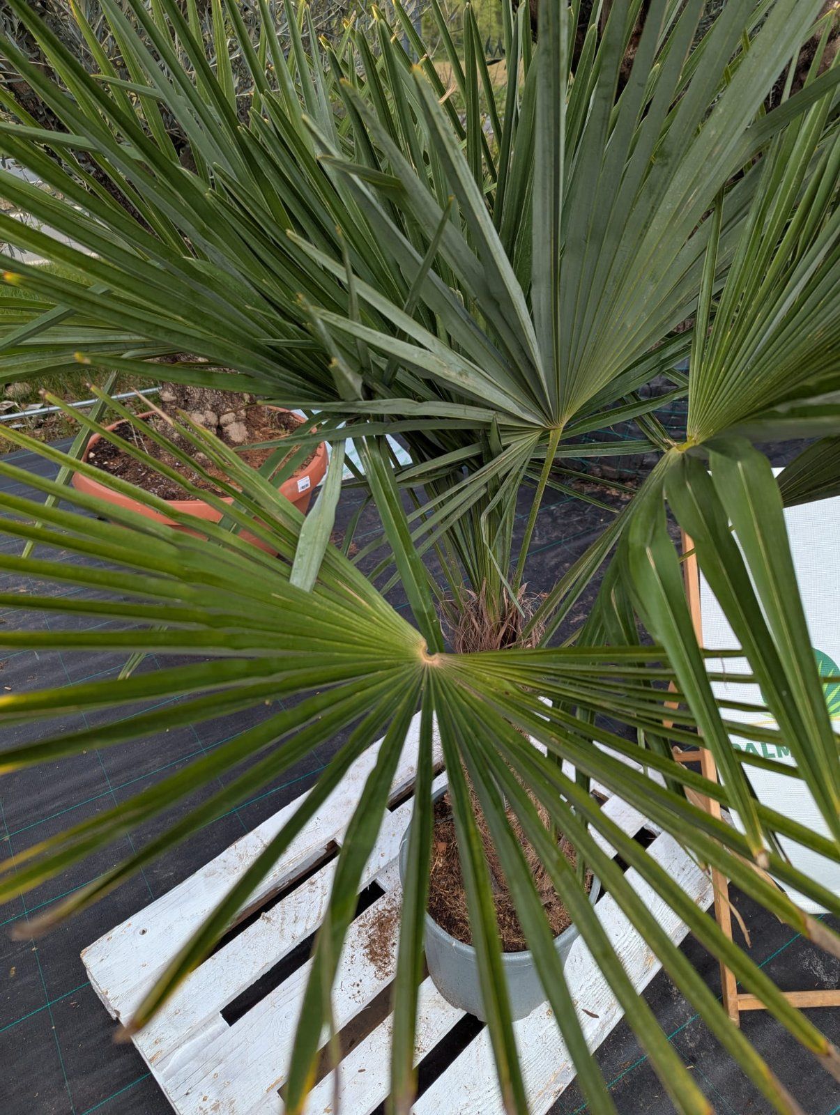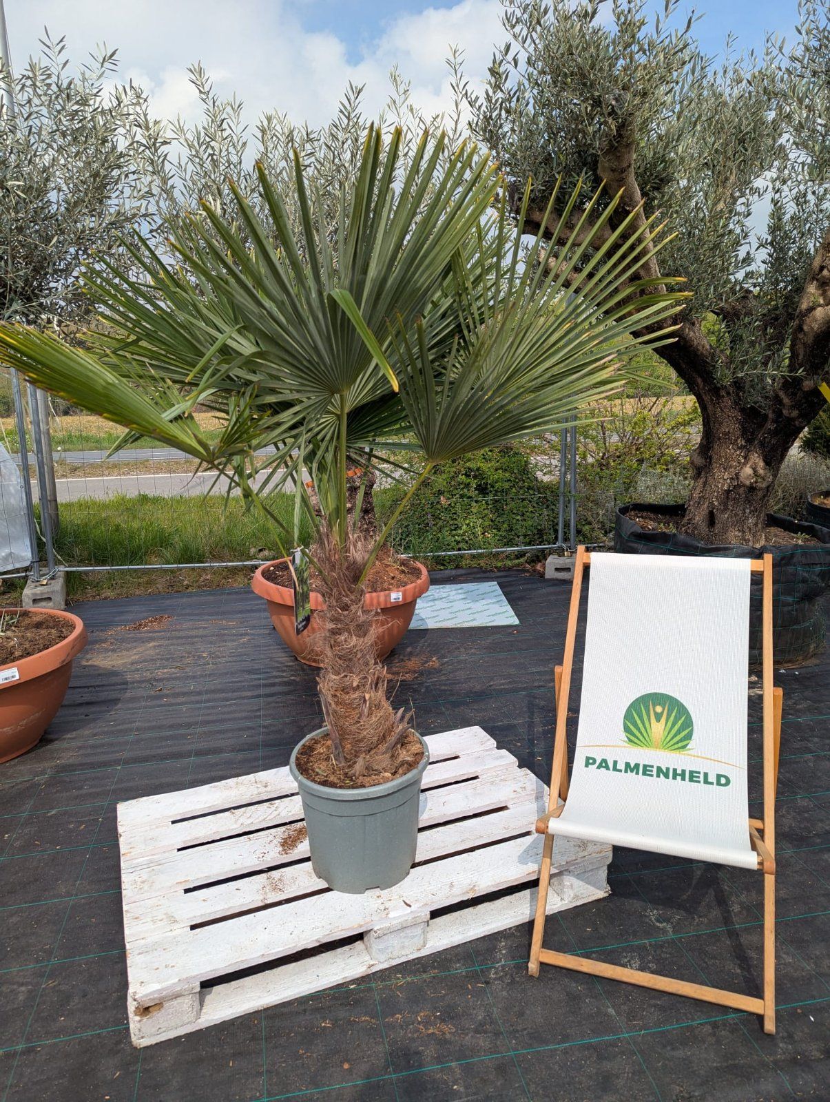 Robuste, winterharte Fächerpalme für Garten, Terrasse & große Kübel – sofort mediterranes Flair dank kräftigem Stamm und dichter Krone. Lieferhöhe 160–200 cm (inkl. Topf).