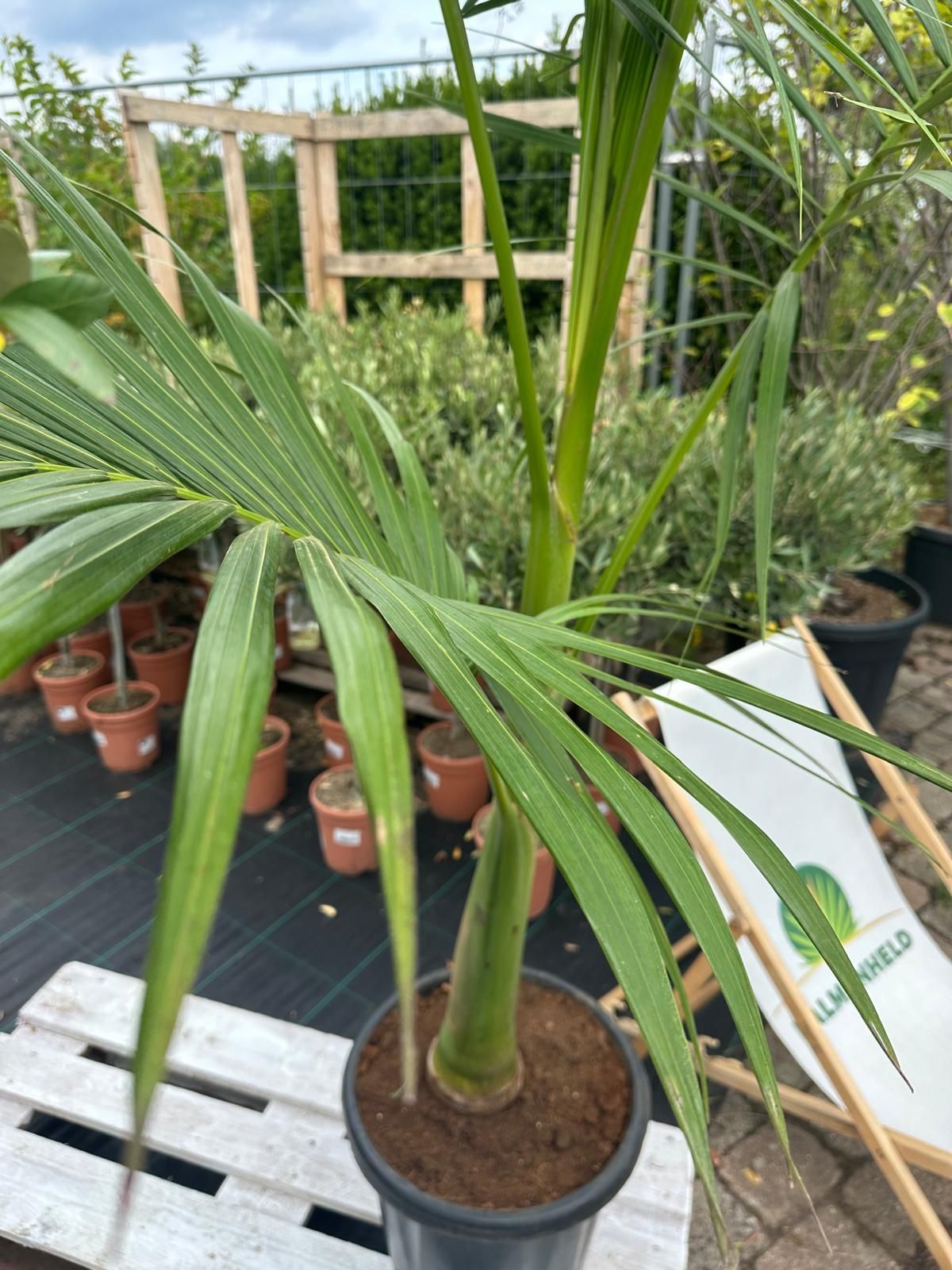 Majestätische Kübelpalme mit eleganten, fein gefiederten Wedeln – ideal für Wintergarten, helle Eingangsbereiche und große Terrassen. Sofort tropisches Ambiente. Lieferhöhe 220–250 cm (inkl. Topf).