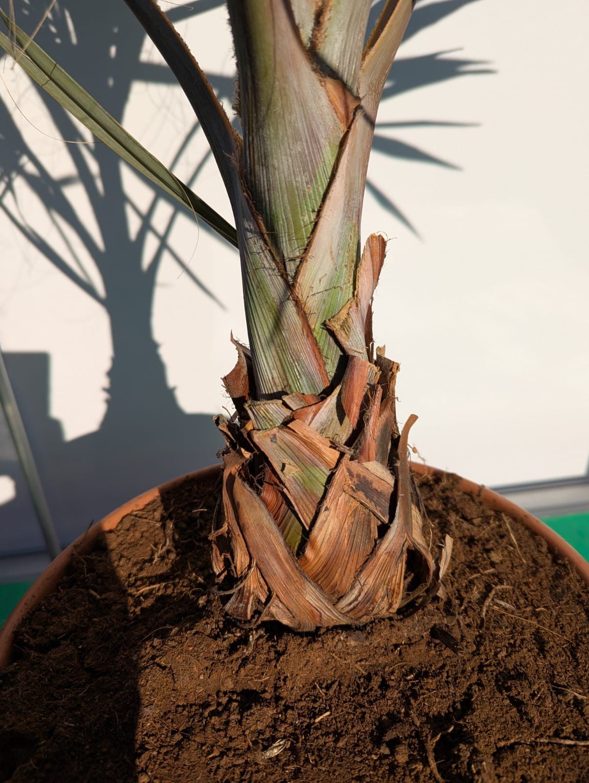 - Wuchsform: aufrechter Einzelstamm, Fächerpalme; sehr langsamer Wuchs