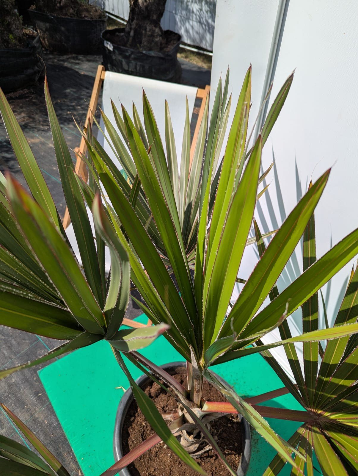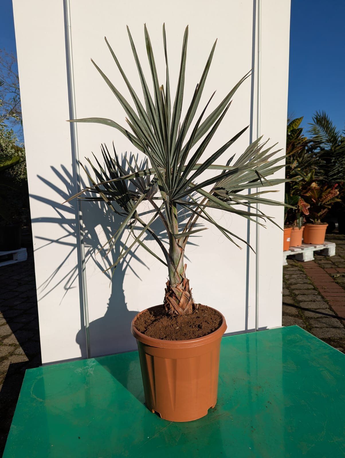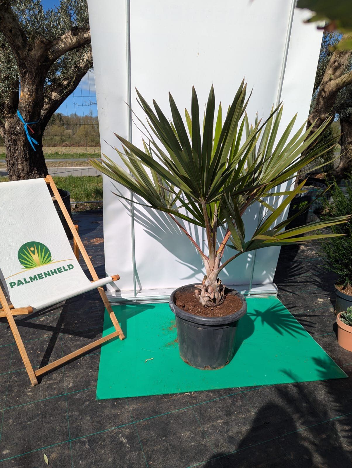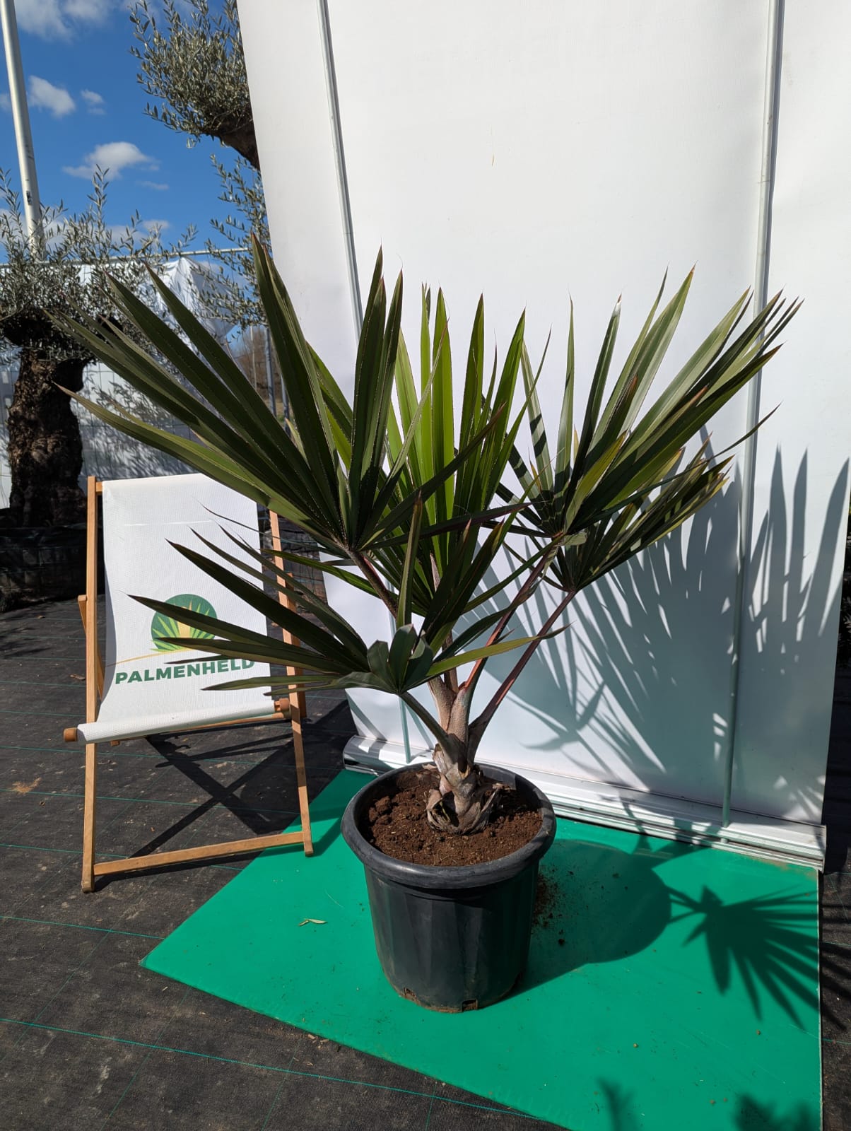 Seltene, exotische Fächerpalme mit eindrucksvollen roten Blattstielen und jungen, rötlich austreibenden Blättern – später sattgrün. Perfekt für Wintergarten, helle Innenräume und geschützte Terrassen. Lieferhöhe 100–120 cm (inkl. Topf).