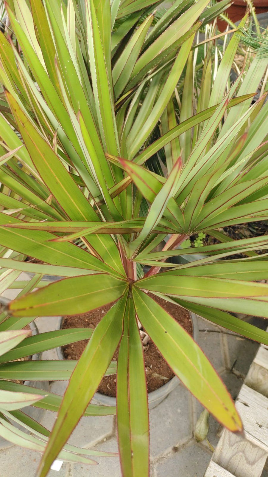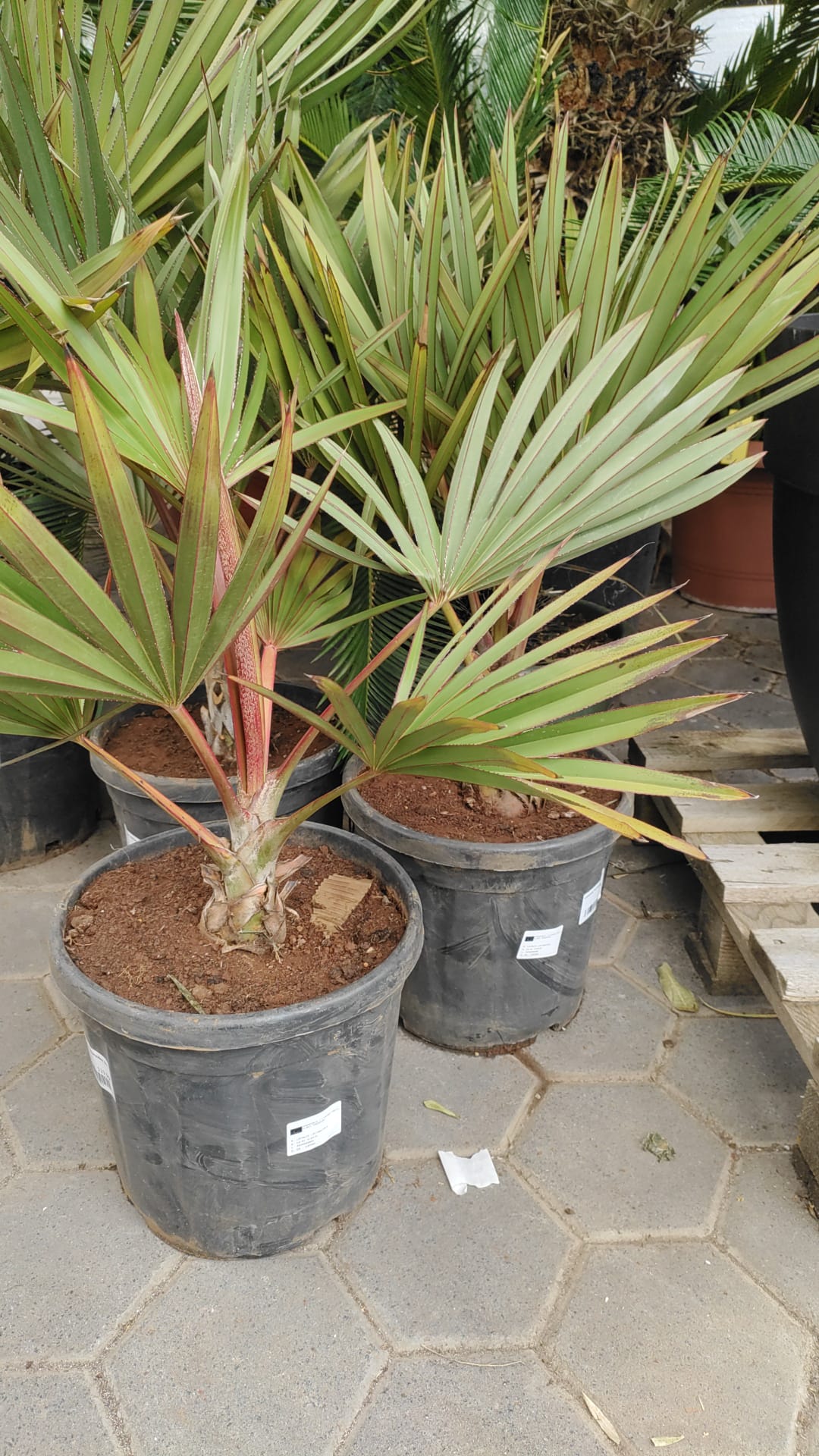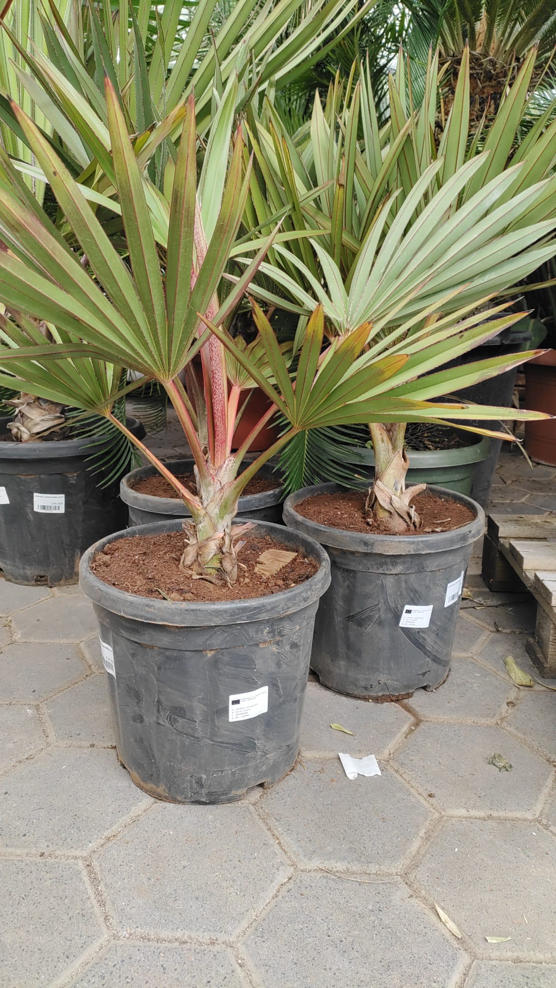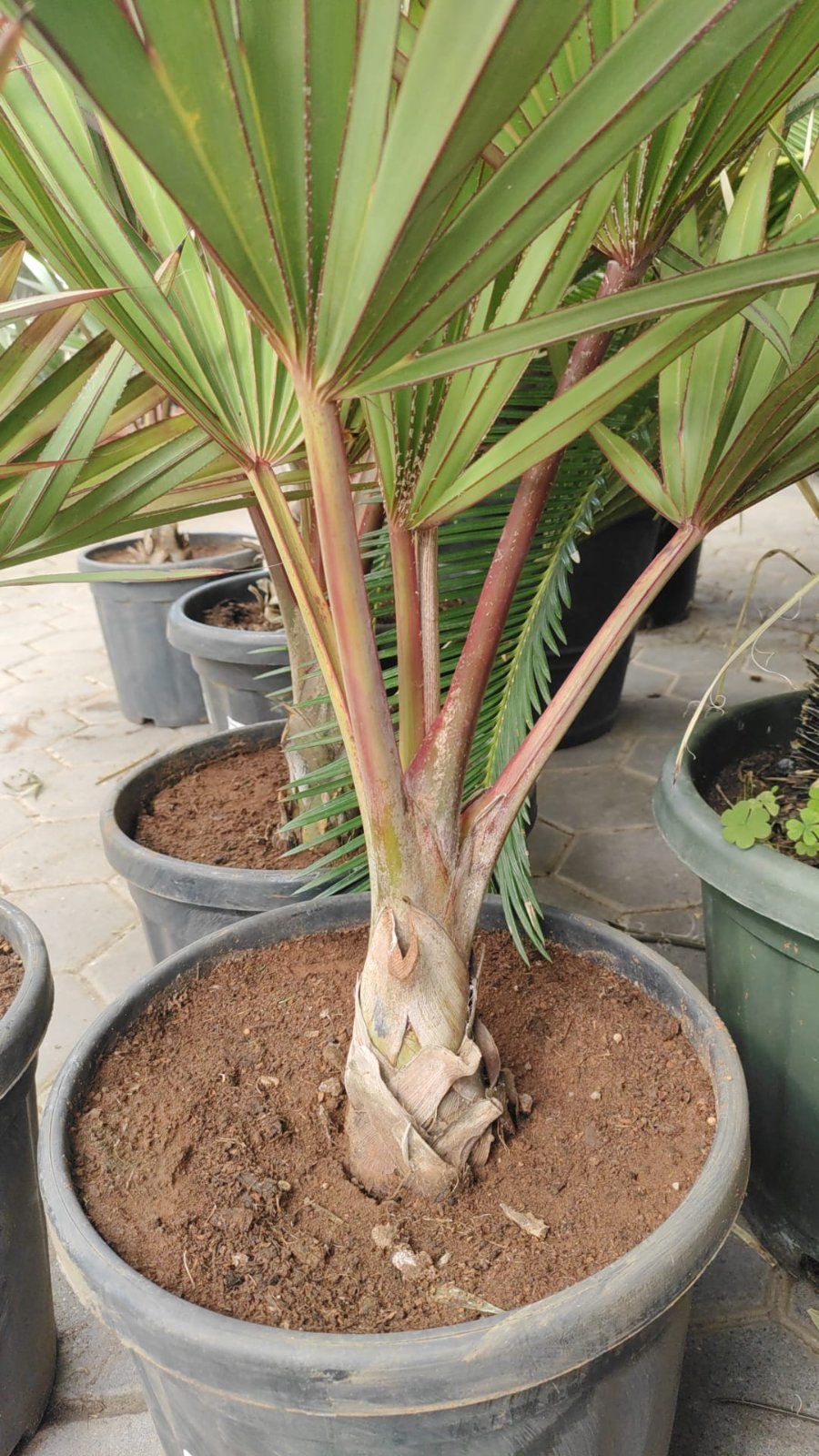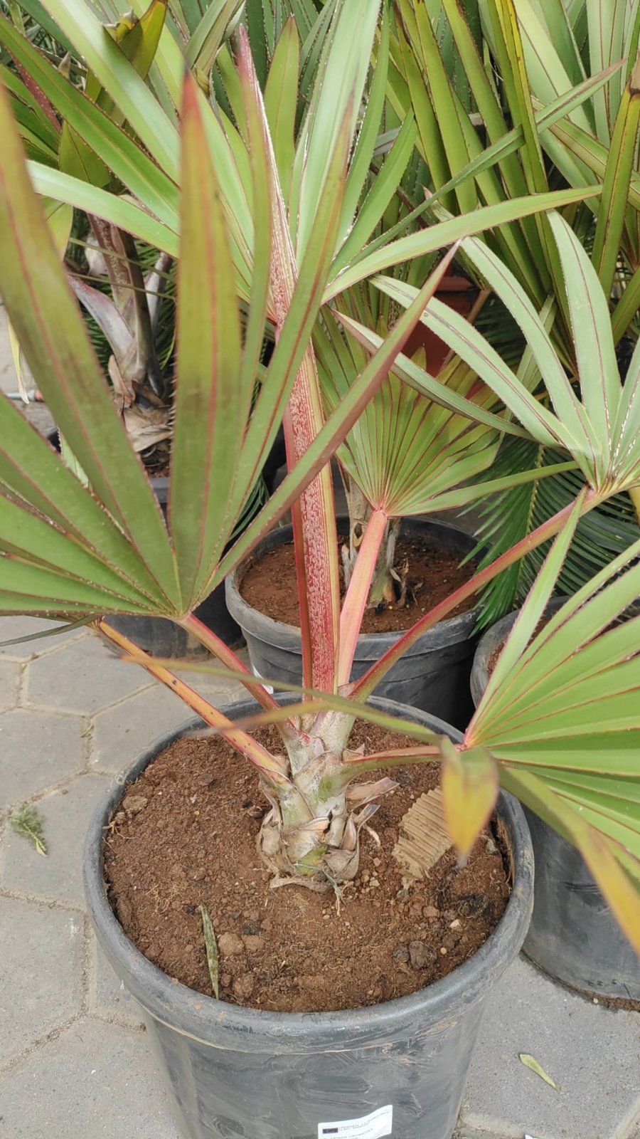 Seltene Fächerpalme mit markant roten Blattstielen und rötlich austreibenden Jungblättern – später sattgrün. Exklusiver Blickfang für Wintergarten, helle Innenräume und geschützte Terrassen. Lieferhöhe 80–100 cm (inkl. Topf).