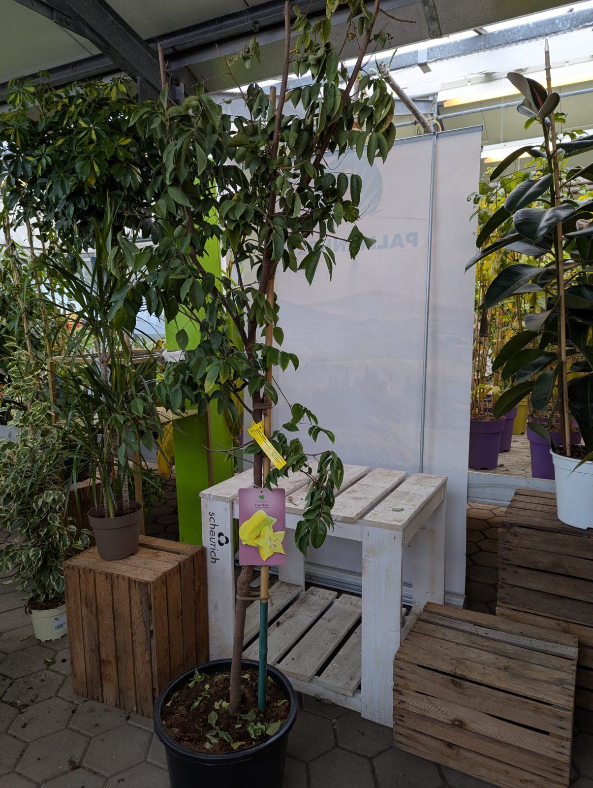 Exotischer, immergrüner Obstbaum mit sternförmigen, vitaminreichen Früchten und zarten rosafarbenen Blüten – ideal für Wintergarten, helle Terrasse oder sonnige Innenräume. Lieferhöhe 200–250 cm (inkl. Topf).