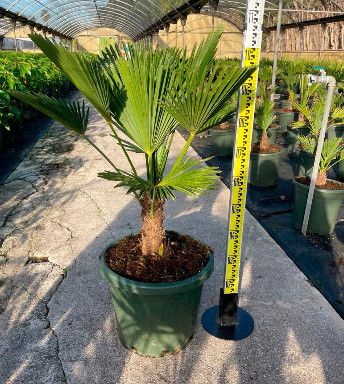 Elegante, kompakte Fächerpalme mit besonders festen, windresistenten Blättern. Das angebotene Exemplar hat eine Lieferhöhe von 75–110 cm (inkl. Topf) bei einer Stammhöhe von ca. 10–20 cm – ideal für mitteleuropäische Gärten, Terrassen und große Kübel.