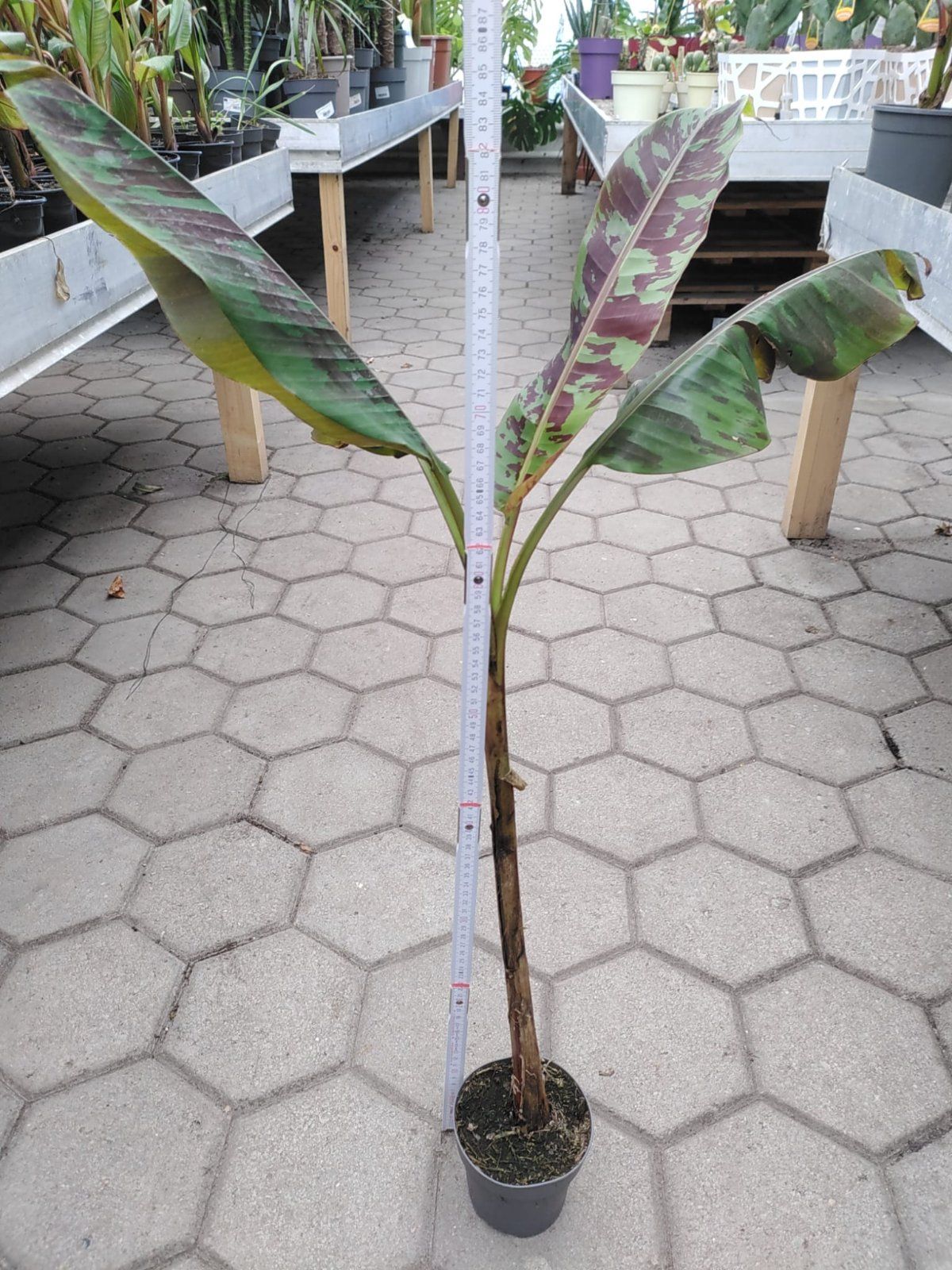 Exotische Zierbanane mit leuchtend roten Blattstielen und spektakulärer rot-grüner Blattzeichnung – ideal für Wintergarten, helle Wohnräume und geschützte Terrassen. Lieferhöhe 70–90 cm (inkl. Topf).